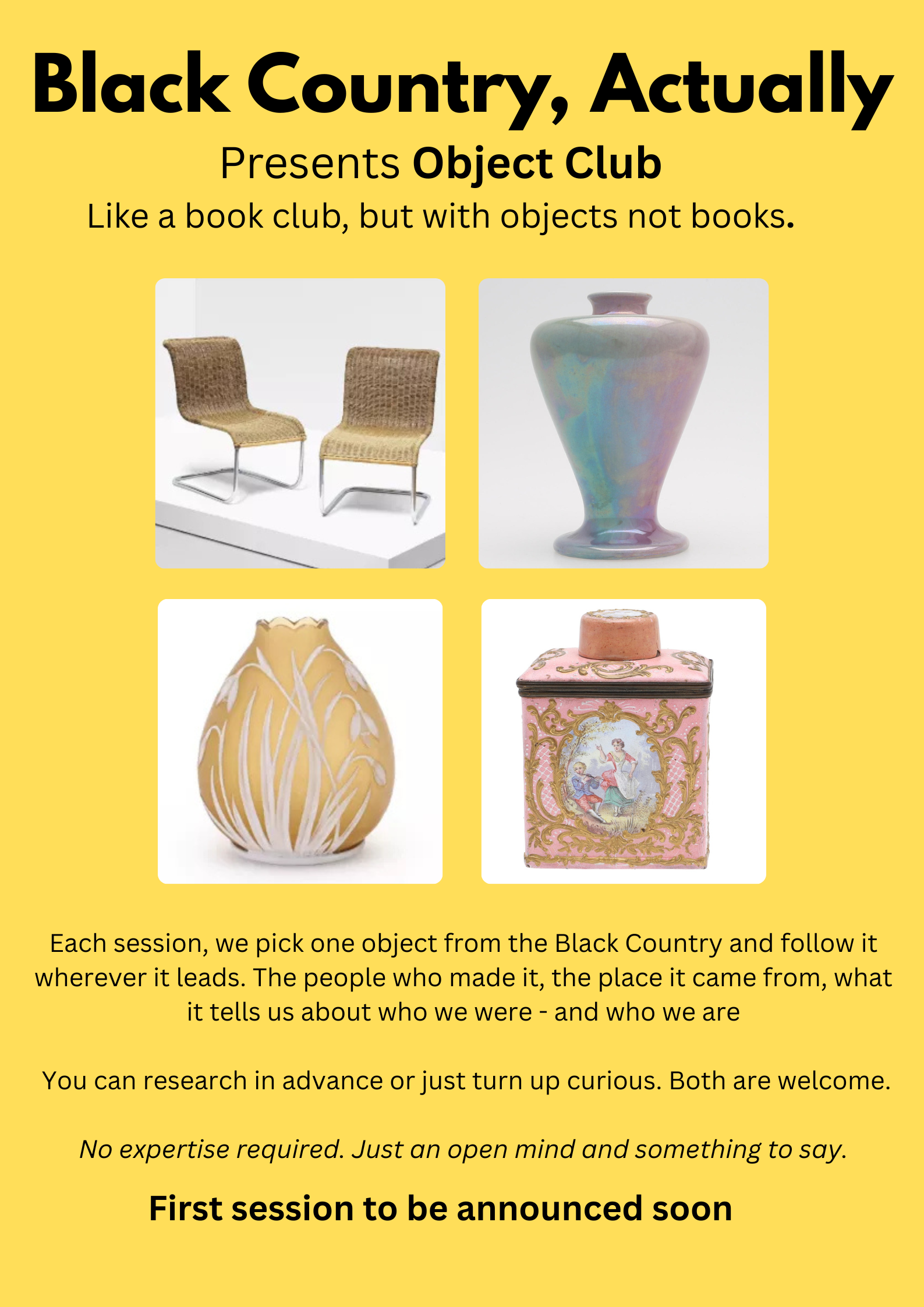 Object Club is a monthly gathering for anyone curious about decorative objects with a Black Country connection. Bring something in - something made here, bought here, inherited here, or that just feels like it belongs here - and we'll talk about it. Where it came from, what it's made of, what it means.